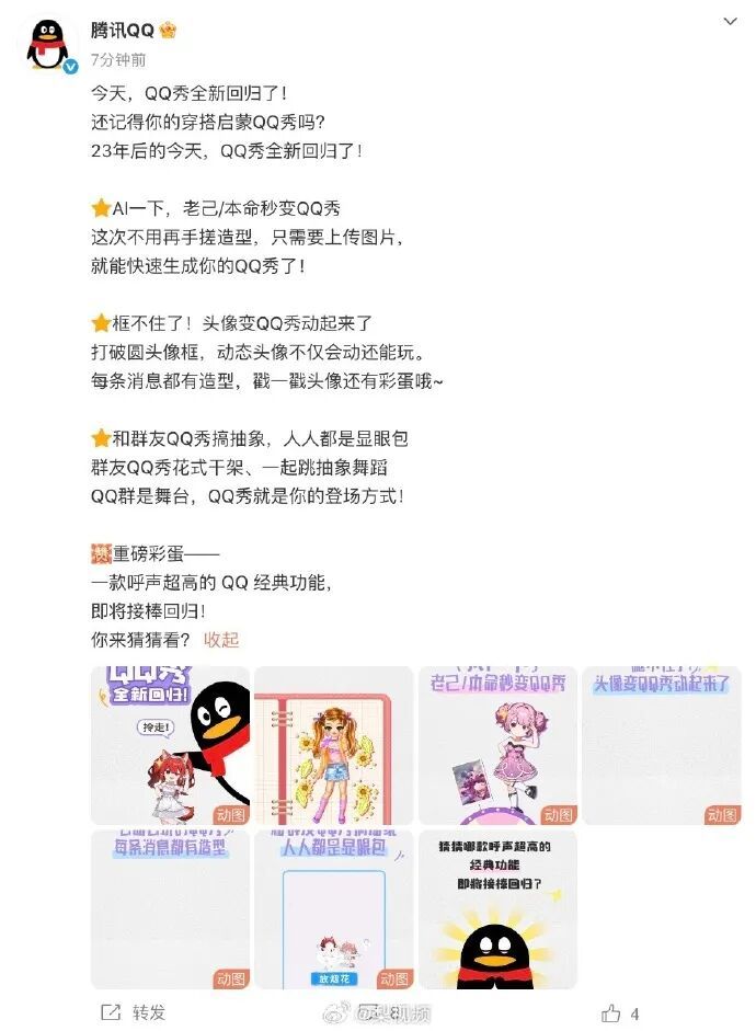 1月24日,腾讯QQ宣布QQ秀回归,手机QQ搜索“QQ秀”即可使用。QQ秀于2003年1月24日上线,而此次更新恰逢23年纪念日。